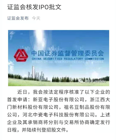 近日ღ✿,据证监会披露ღ✿,证监会已按照法定程序核准了以下企业的首发申请ღ✿:新亚电子股份有限公司ღ✿、浙江西大门材料股份有限公司ღ✿、祖名豆制品股份有限公司ღ✿、河北中瓷电子科技股份有限公司ღ✿。上述企业及其承销商将分别与交易所协商发行日程ღ✿,并陆续刊登招股文件ღ✿。